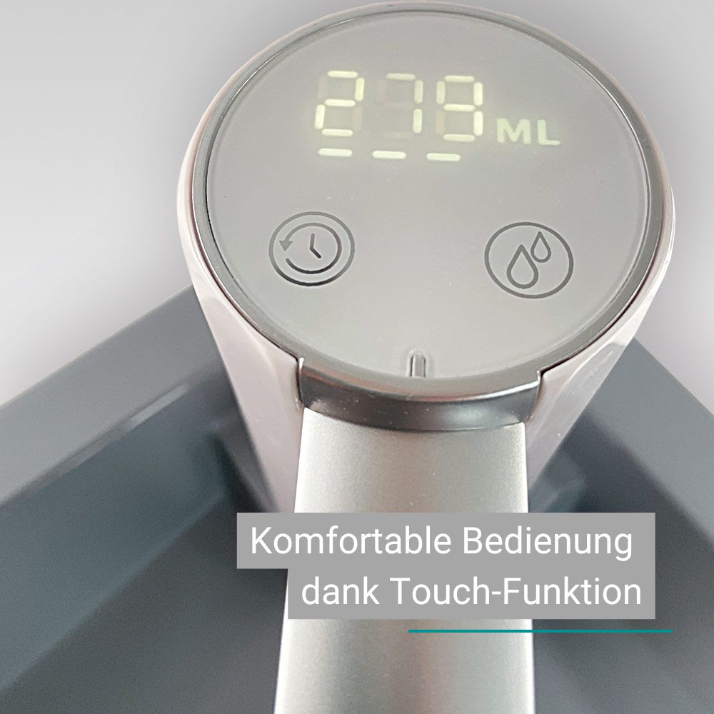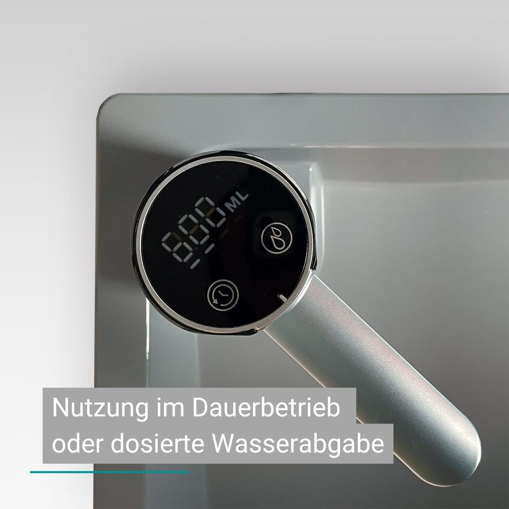 - Flexible Wasserabgabe: wähle zwischen voreingestellten Mengen oder Dauerbetrieb