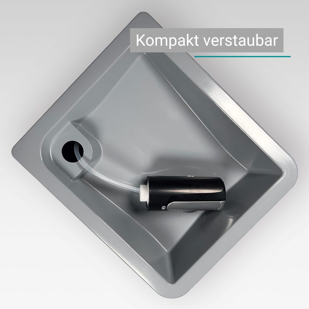 Die Kombination aus hochwertigem ABS-Kunststoff mit PMMA-Beschichtung macht Splash langlebig, robust und leicht zu reinigen. Der abnehmbare, einklappbare Wasserhahn sorgt dafür, dass Du das Waschbecken besonders platzsparend verstauen kannst – perfekt für Vanlife, Camper oder jede Outdoor-Küche.